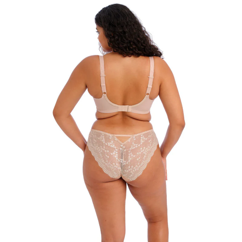 The Charley plunge bra in fawn nude combines a light diamond mesh fabric with stretch lace, and features a heritage inspired meadow flower embroidery across select pieces.