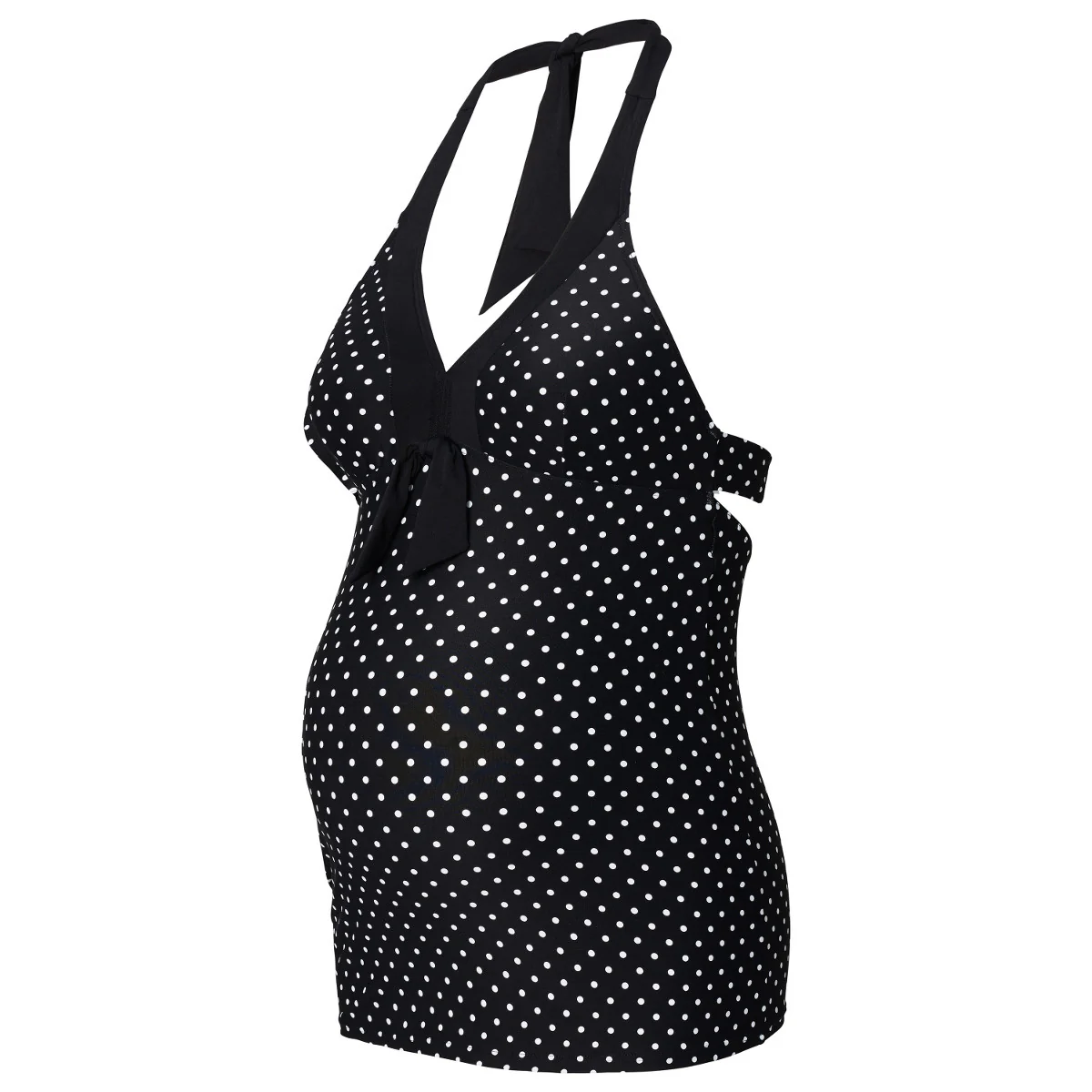 This sophisticated maternity tankini top by Noppies features a contrasting white on black polka dot print, perfect for some fun in the sun! This tankini top has an adjustable halter tie neck, cute bow detailing and a long length design that is perfect for months 1-9 of pregnancy and beyond.