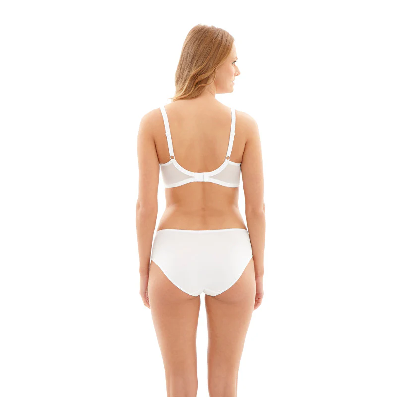 The Tango white balconette bra by Panache Lingerie features delicately embroidered mesh that offers the ultimate support for cup sizes D to K. Tango's underwire cups, light lining and clever design make this the perfect bra for every day wear.